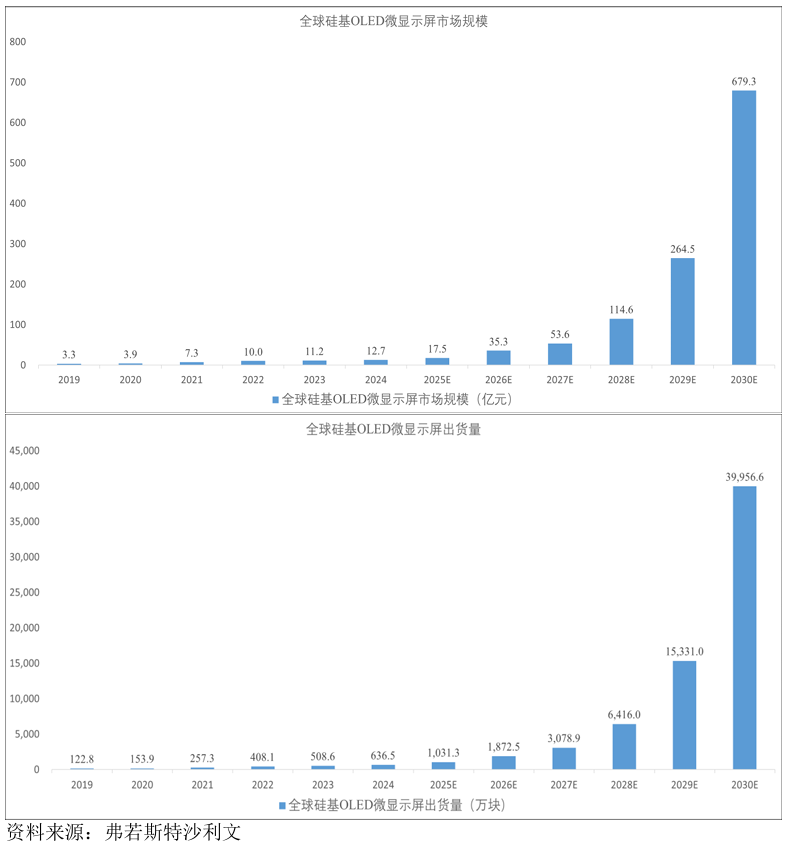 根据弗若斯特沙利文数据显示,全球硅基OLED显示屏销售额从2020年的3.9亿元飙升至2024年的12.7亿元,年均复合增长率达34.3%;预计到2030年,这一数字将暴涨至679.3亿元,年复合增长率高达94.11%。