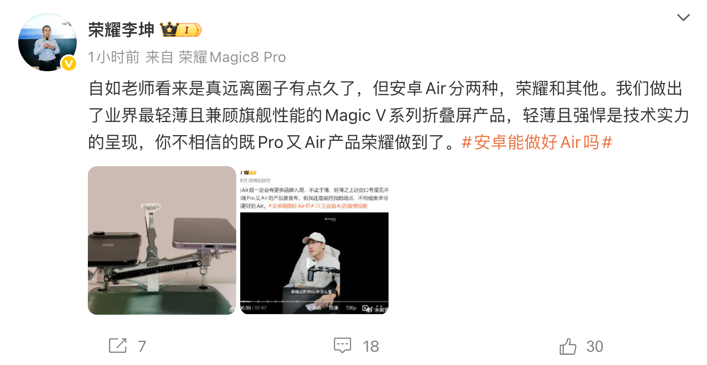 凤凰网科技讯 1月5日,荣耀终端股份有限公司旗舰手机产品经理李坤发文称,“自如老师看来是真远离圈子有点久了,安卓Air分两种,荣耀和其他。我们做出了业界最轻薄且兼顾旗舰性能的Magic V系列折叠屏产品,轻薄且强悍是技术实力的呈现,你不相信的既Pro又Air产品荣耀做到了。”