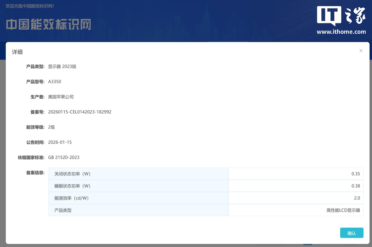 IT之家 1 月 16 日消息,一款型号为 A3350 的未发布苹果显示器现身中国能效标识中心数据库,备案日期显示为 2026 年 1 月 15 日。该设备被归类为“显示器 2023 版”标准,能效等级为 2 级,确认采用 LCD 面板而非此前传闻的 OLED。