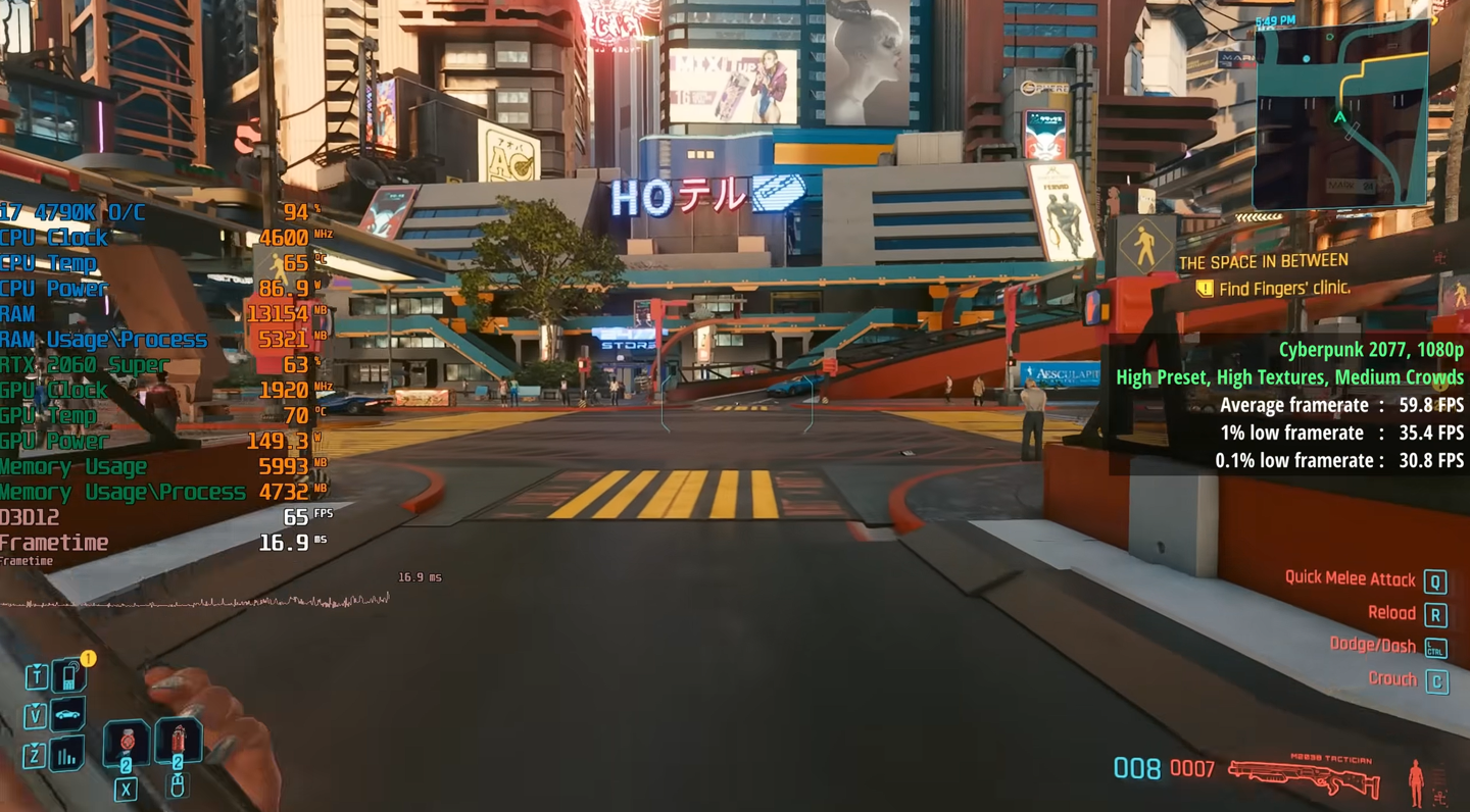| 赛博朋克 2077 | 59.8 | 35.4 | 高预设,高纹理,中等人群密度,1080P |