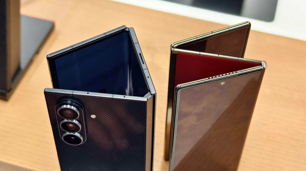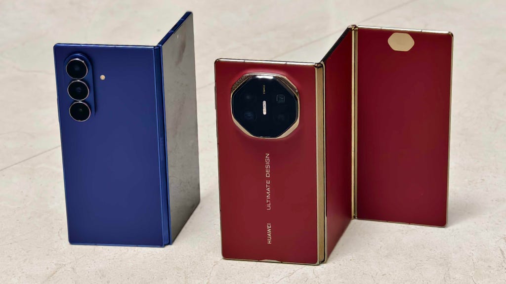 三星Galaxy Z TriFold(左)的两个铰链均朝同一方向折叠,形成“C”形,而华为Mate XT(右)的两个铰链则朝相反方向折叠,形成“Z”形。Prakhar Khanna/CNET