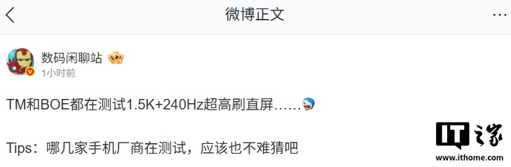 IT之家 1 月 23 日消息,博主 @数码闲聊站 今日爆料称,天马和京东方都在测试 1.5K+240Hz 超高刷直屏。评论区有网友猜测“子系全员测”,该博主回复称:“没有全员,iQOO All in 2K”。