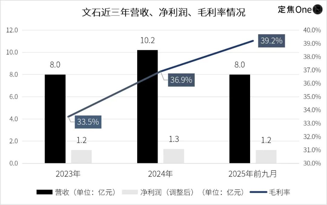 从规模上看,文石的营收增长相对稳健。招股书显示,2023年、2024年及2025年前九个月,文石营收分别为8.0亿元、10.2亿元和8.0亿元。