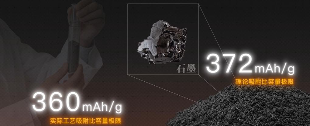 其实在此之前,整个电池行业在石墨材料上已经停滞了整整十年,主要原因是石墨这个东西它的吸附比容量极限是 372mAh/g ,而在过去的这几年里,工程师们就算把工艺压榨到极致,也只做到了 360mAh/g 左右。