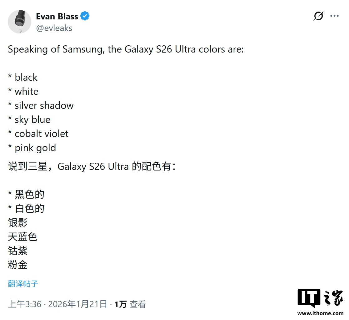 IT之家 1 月 26 日消息,消息人士@UniverseIce 前天在 X 平台透露,三星 Galaxy S26 Ultra 手机将拥有纯白色版本,“非常迷人”。随后另一位爆料人 Max Jambor 也认同了他的说法,并认为该机的白色配色“非常漂亮”。