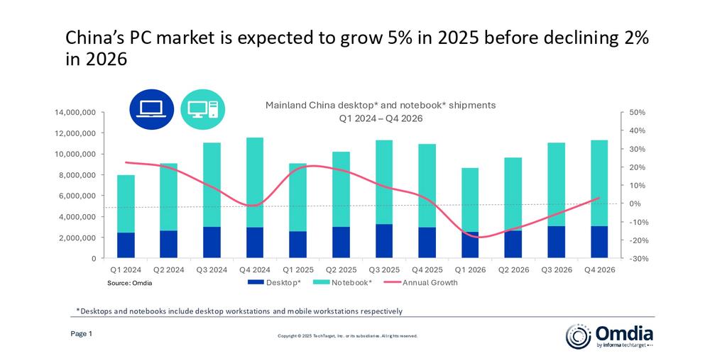 2025年第三季度,中国PC市场同比增长仅2%,而同期IDC等机构数据显示,全球PC出货量同比增长8%-9%左右。Omdia在最新报告中指出,目前中国补贴的覆盖范围和实际拉动效果都已明显减弱,预测2026年中国PC整体出货量将下降2%。
