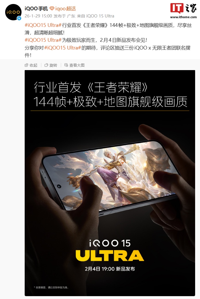 IT之家 1 月 29 日消息,iQOO 手机官方今日宣布,iQOO 15 Ultra 将行业首发《王者荣耀》144 帧 + 极致 + 地图旗舰级画质,宣称“超清晰超细腻”。