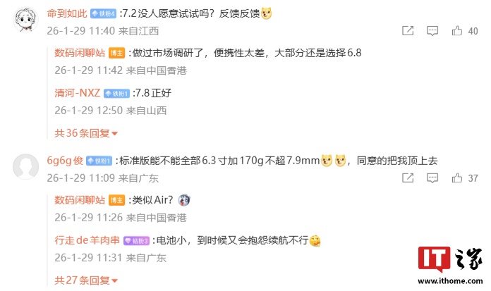 IT之家注意到,有网友询问是否会推出 7.2 英寸屏幕的手机,博主表示:“做过市场调研了,便携性太差,大部分还是选择 6.8。”