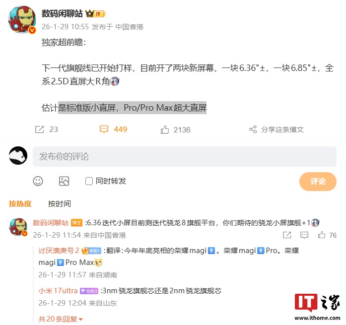 IT之家 1 月 29 日消息,博主 @数码闲聊站 今日发文透露某厂下一代旗舰线新机已开始打样,目前开了两块新屏幕: 6.36"± 和 6.85"±,全系为 2.5D 直屏大 R 角设计。博主“估计”是标准版小直屏,Pro / Pro Max 超大直屏。