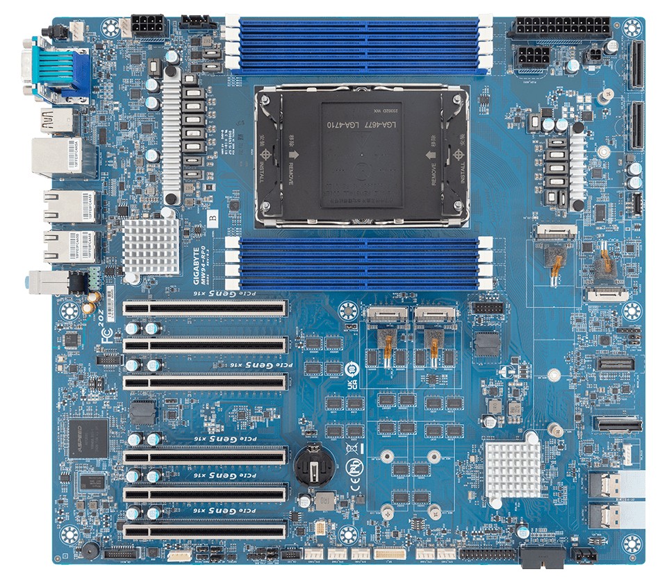 MW94-RP0 主板采用 E-ATX 板型,配备 8 通道 1DPC 共 8 根 DDR5 RDIMM / MRDIMM 内存插槽,提供 7 条 PCIe 5.0×16 插槽、4 个 M.2 PCIe 5.0×4 盘位、2 个 MCIO PCIe 5.0×8 接口、1 个 SlimSAS PCIe 4.0×8 接口、2 个 SlimSAS 4×SATA 接口。