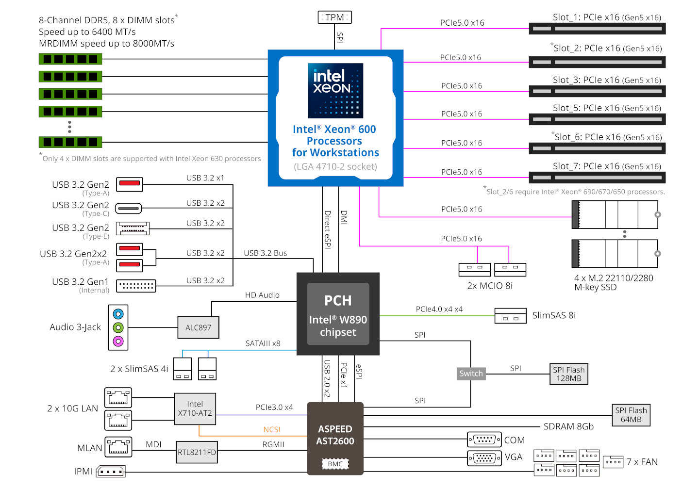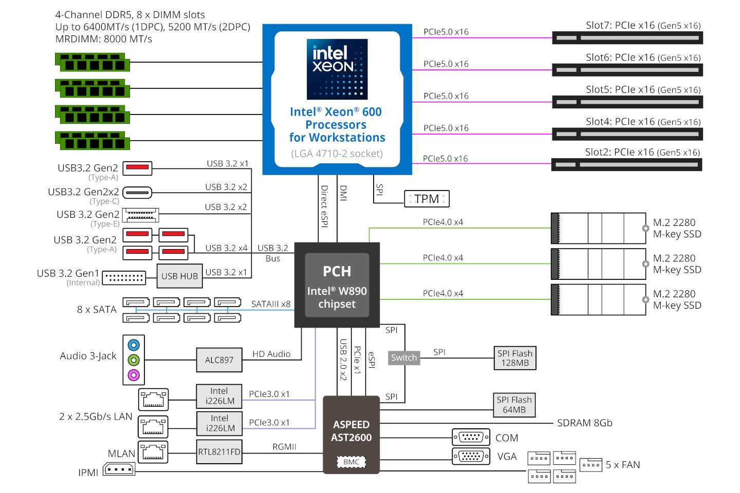 其提供 5 个 PCIe 5.0×16 插槽、3 个 M.2 PCIe 4.0×4、8 个 SATA,提供 2 个 2.5GbE RJ45 网口,配备基于信骅 ASPEED AST2600 芯片的 BMC 模块,前后各有 1 个 USB-C 20Gbps 接口。