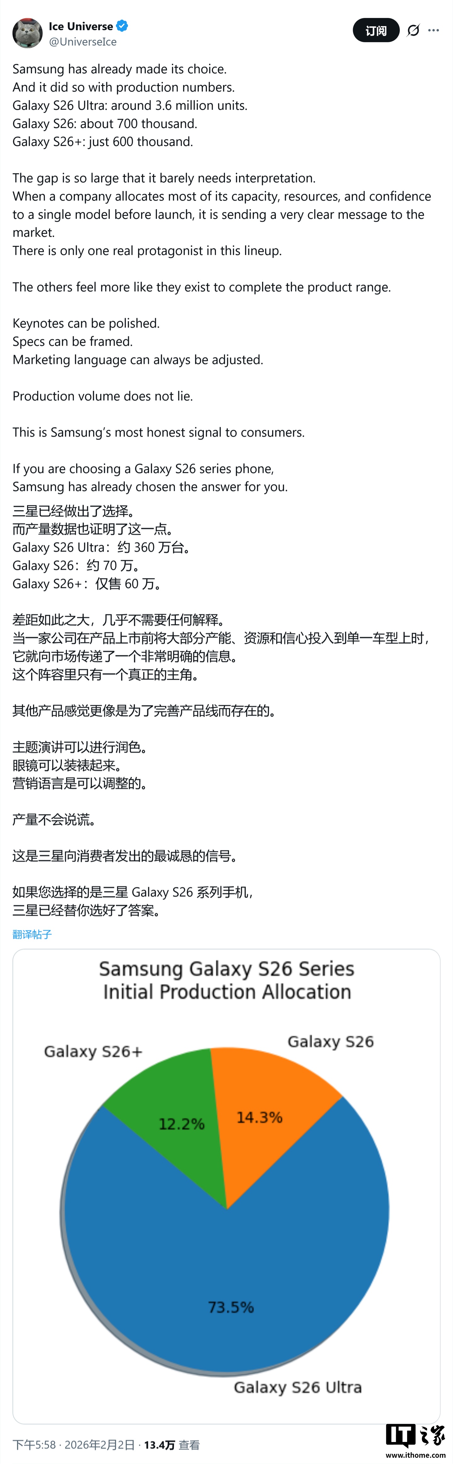 IT之家 2 月 3 日消息,消息源 @UniverseIce 昨日(2 月 2 日)在 X 平台发布推文,披露三星 Galaxy S26 系列手机的首批投产计划,揭示了该品牌在产品策略上的重大调整。