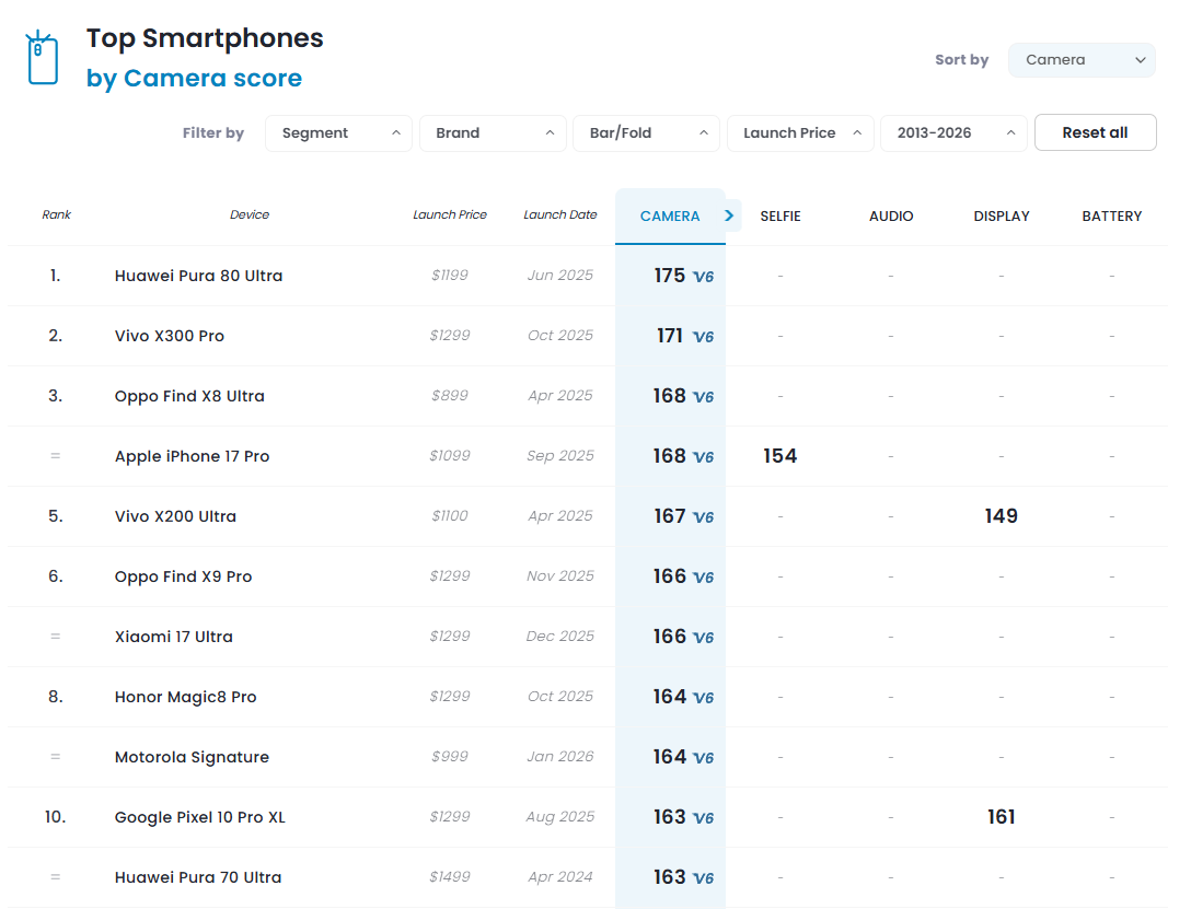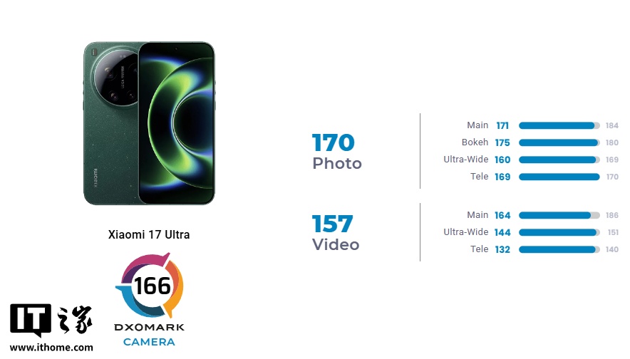 在 DXOMARK 影像第六版基准测试中,小米 17 Ultra 获得 166 分,在全球影像排行榜中位列第 6,与 OPPO Find X9 Pro 并列,获 DXOMARK 相机金标(>160 分)认证。