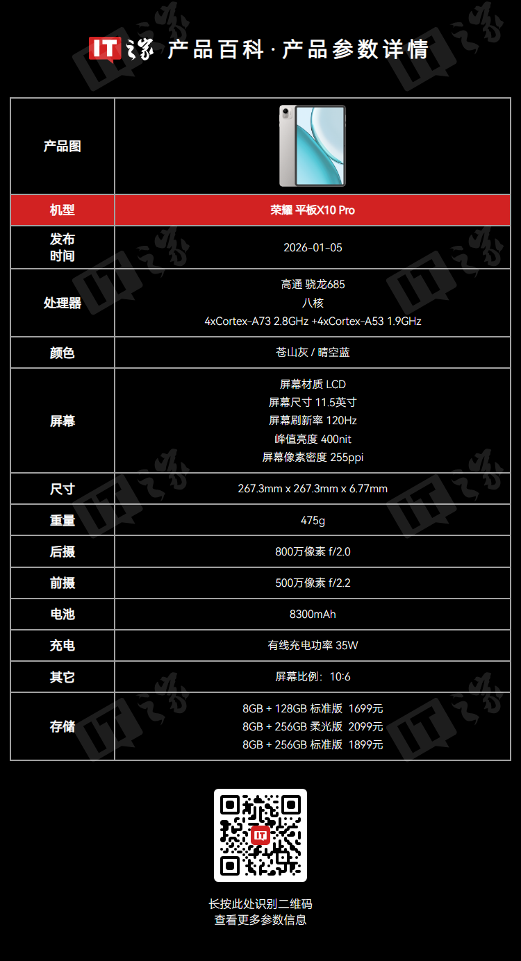 IT之家注意到,荣耀平板 X10 Pro 已于 1 月 5 日发布,该机搭载 11.5 英寸 2508x1504 120Hz LCD 屏幕,使用全金属机身,搭载高通骁龙 685 处理器 + 8GB RAM,内置 8300mAh 电池,拥有北京四中网校海量学习资源,上市价格 1499 元起。