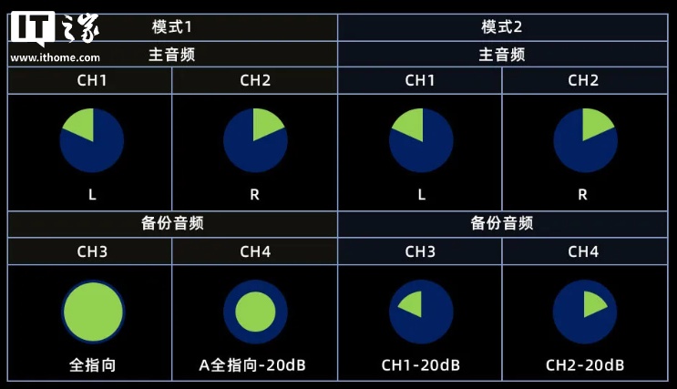 在四通道模式下,DMW-DMS1 可选 CH3 全指向、CH4 全指向 -20dB,或 CH3=CH1-20dB、CH4=CH2-20dB(目前仅 S1M2 系列、S1RM2 支持)。