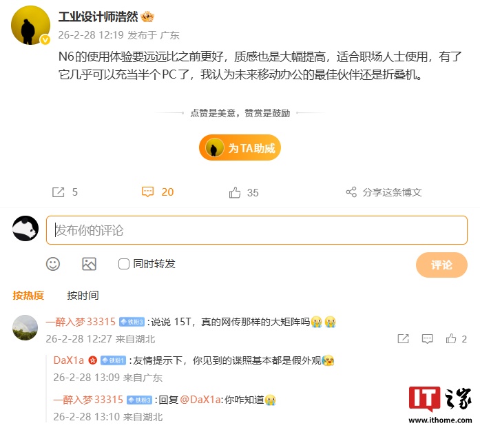 IT之家注意到,OPPO 工业设计中心总经理刘浩然昨日发文“剧透”了这款折叠屏新机。他表示,Find N6 的使用体验要远远比之前更好,质感也是大幅提高,适合职场人士使用,几乎可以充当半个 PC。
