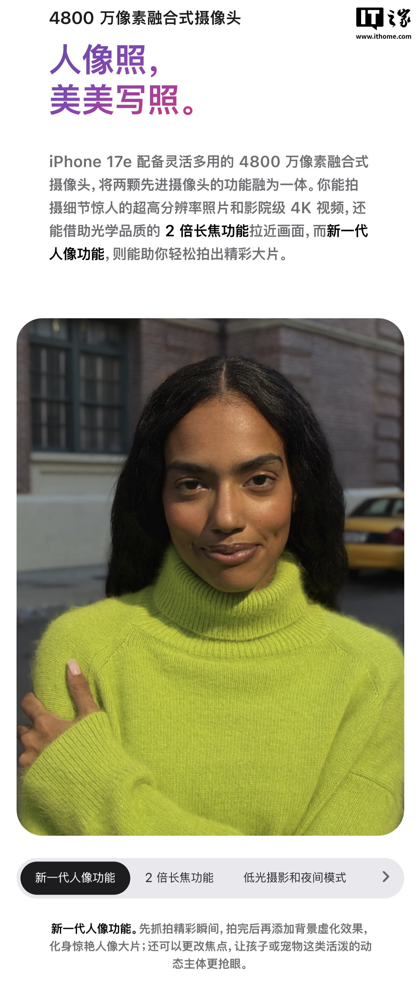 影像方面,新一代人像可自动识别人、狗、猫,拍摄后保存景深信息,用户可在照片 App 中一键生成人像、调整虚化程度与对焦点。