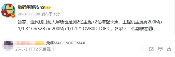 【CNMO科技消息】3月3日,数码博主@数码闲聊站 爆料称,某手机品牌的迭代大屏版本正在测试双2亿像素方案,分别应用于主摄与潜望长焦。结合博主表情暗示及评论区信息来看,该机可能为荣耀Magic9 Pro Max。