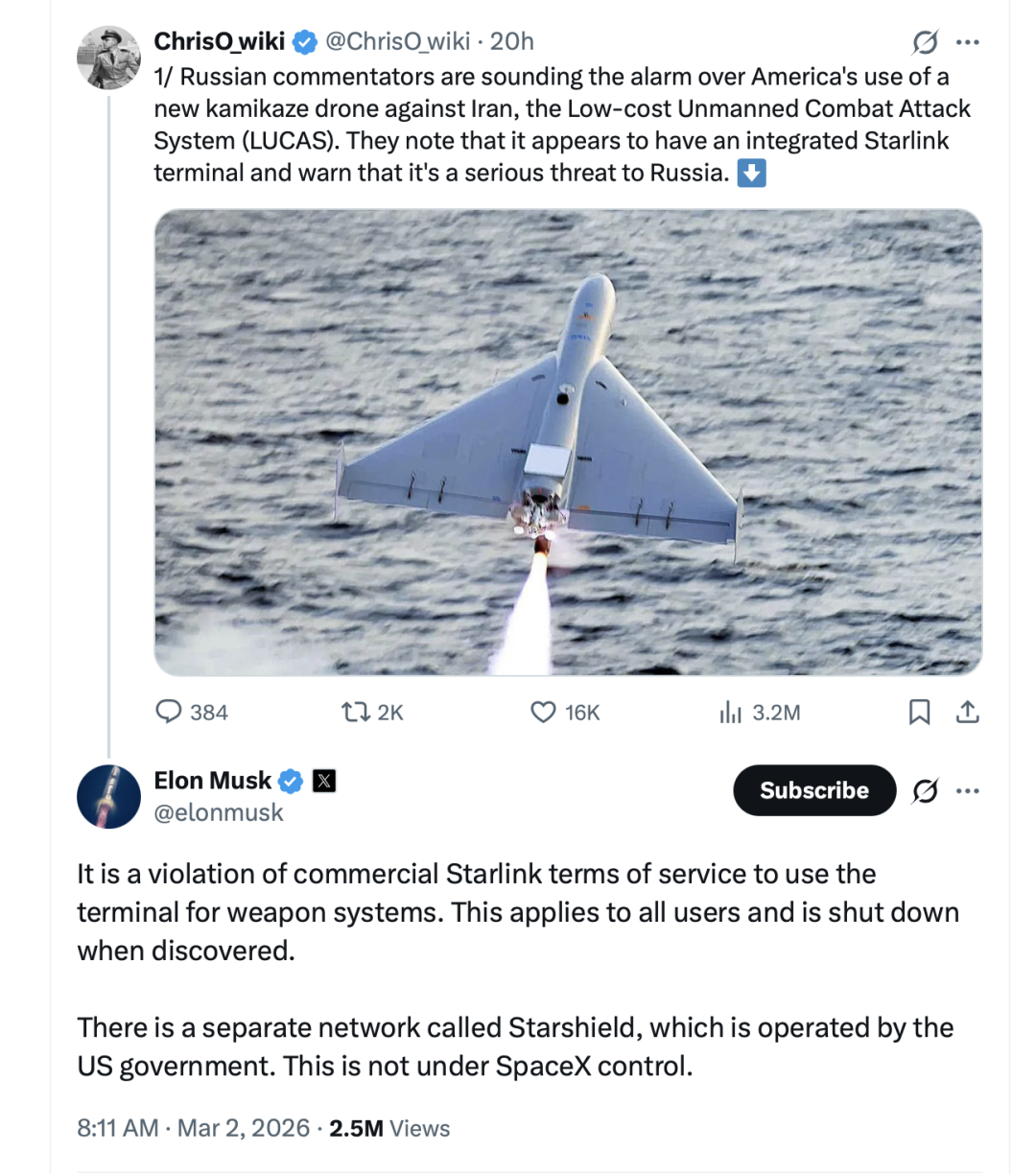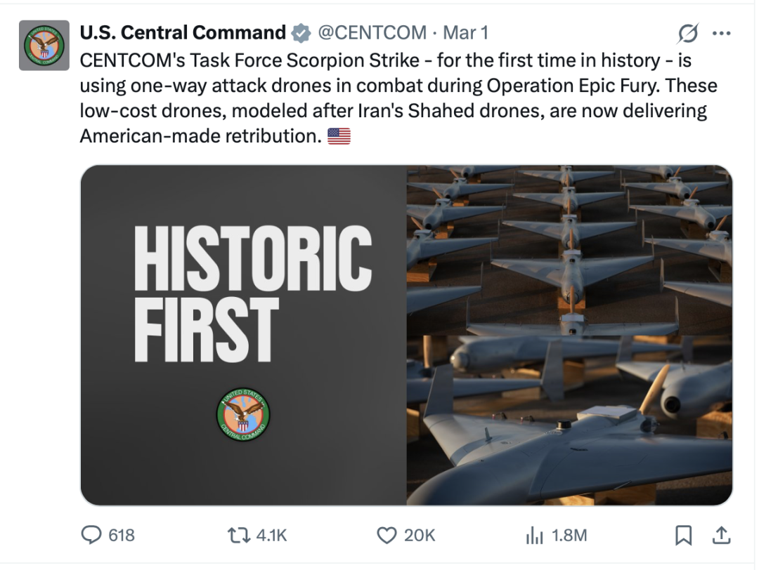 3月1日,军事分析师ChrisO_wiki发布了一则推文,美国新型“神风”无人机LUCAS首次实战伊朗,机身疑似集成星链终端。