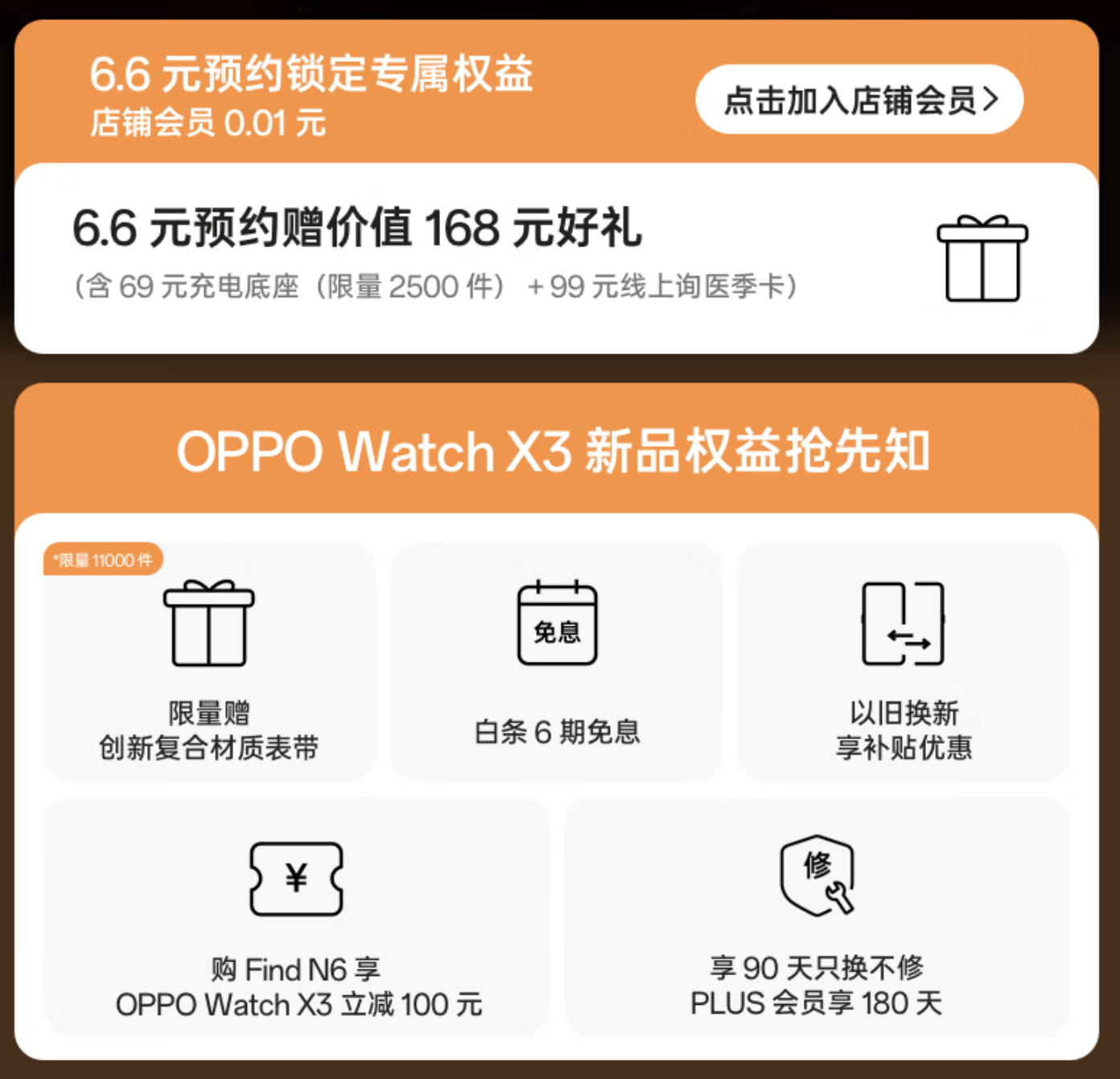 IT之家 3 月 3 日消息,OPPO Watch X3 智能手表现已在京东开启新品预约,有望与 Find N6 大折叠手机同期发布。