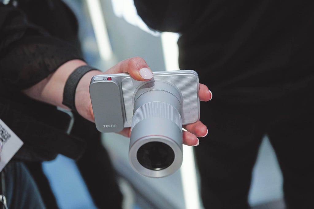 Tecno手机的核心,是一款极致纤薄的安卓手机,其背面巧妙设计了几个连接器。这些连接器可与公司在巴塞罗那MWC展台上展示的各式模块无缝对接。作为一名摄影爱好者,我自然对那个巨型变焦模块情有独钟。