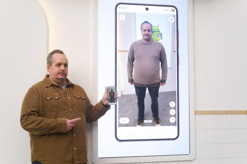 在另一个展位,我体验了谷歌“圈选搜索”的一项更新功能,它能同时识别你屏幕上的所有服饰单品,并让你进行虚拟试穿。