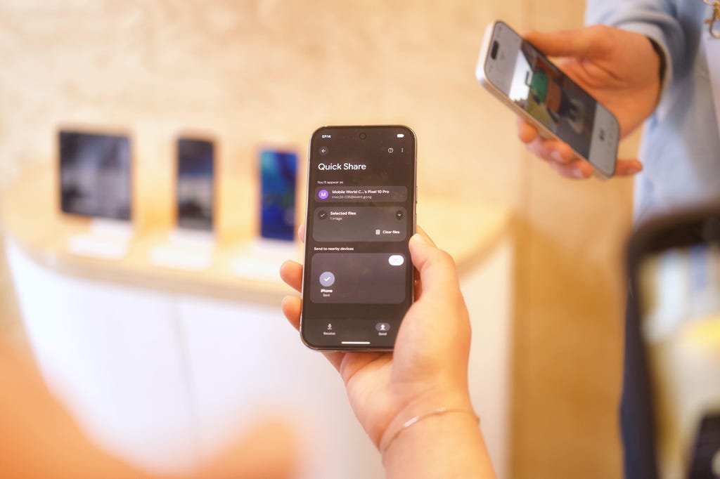 快速共享/AirDrop兼容性让新款Pixel手机和iPhone之间的媒体传输变得更加轻松自如。Andrew Lanxon/CNET