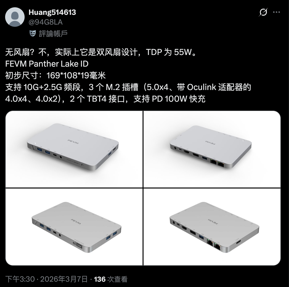 IT之家 3 月 8 日消息,消息人士 Huang514613 昨天在 X 平台发文,曝光 FEVM 的新款迷你主机,新品将搭载英特尔“Panther Lake”架构处理器,体积较薄。
