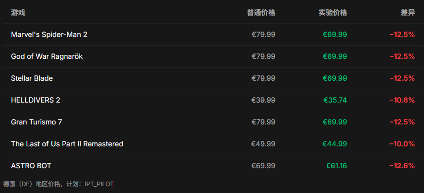 价格差异方面,根据 PSPrices 的数据,不同用户看到的折扣幅度从 5.3% 到 17.6% 不等。例如,标准售价 69.99 欧元的《宇宙机器人》部分用户看到的价格为 61.16 欧元,折扣 12.6%;而《战锤 40K:星际战士 2》的差价更为明显,部分用户可享受高达 16.6% 的折扣;最高的《WWE 2525》甚至达到了 17.6% 的差异。