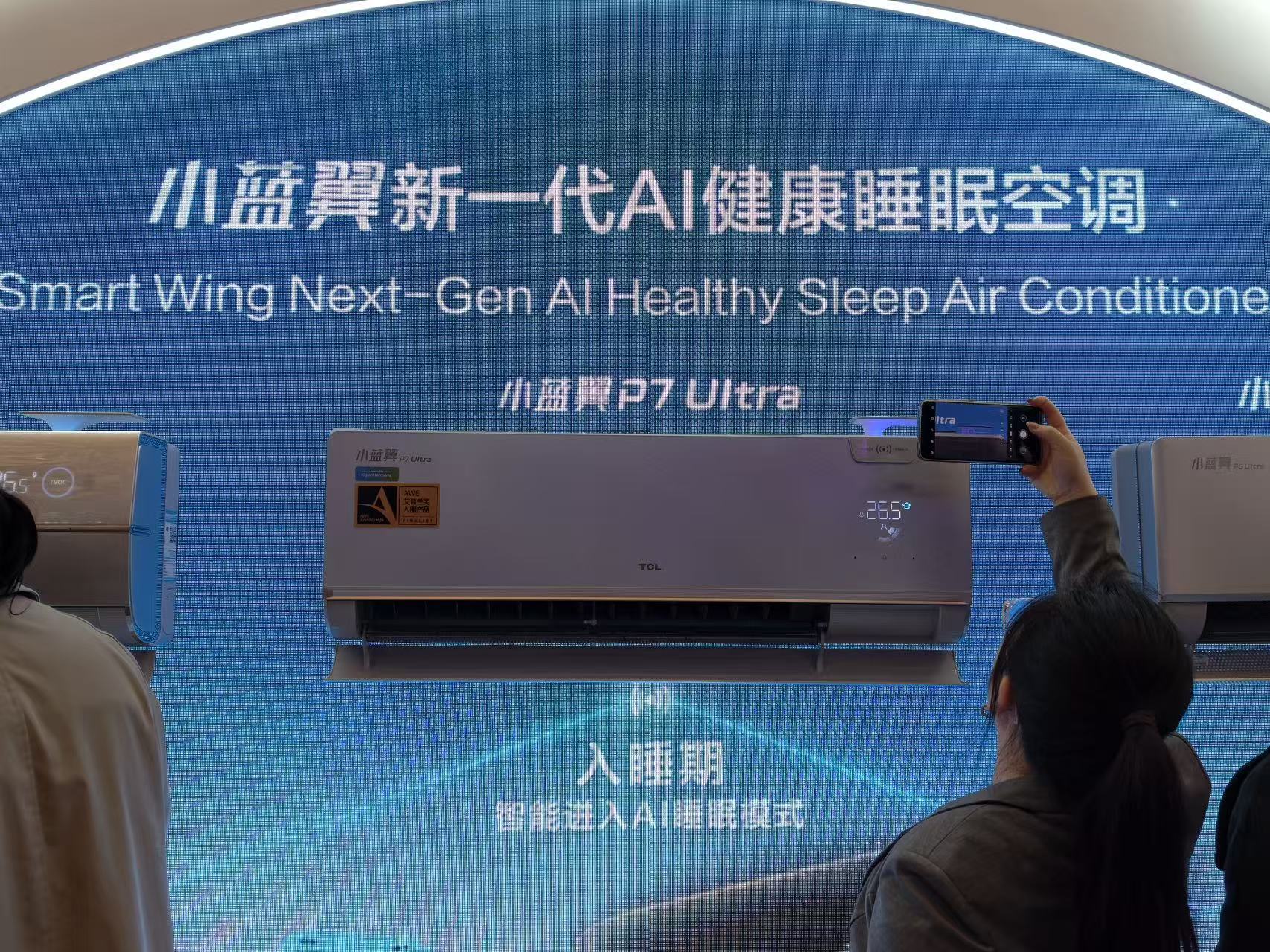 AWE2026 上,TCL 拿出来的小蓝翼 P7 Ultra,它最大的亮点就是配备了毫米波雷达、AI 安寝之眼、双循环新风。小蓝翼 P7 Ultra 能够根据人体睡眠阶段变化,动态调整温度、风速和新风状态。新风状态下能给到60m³/h 新风量,配合微正压换新风技术,其中PM2.5、二氧化碳和甲醛的置换效率分别达到99.55%、99.10%和91.94%。