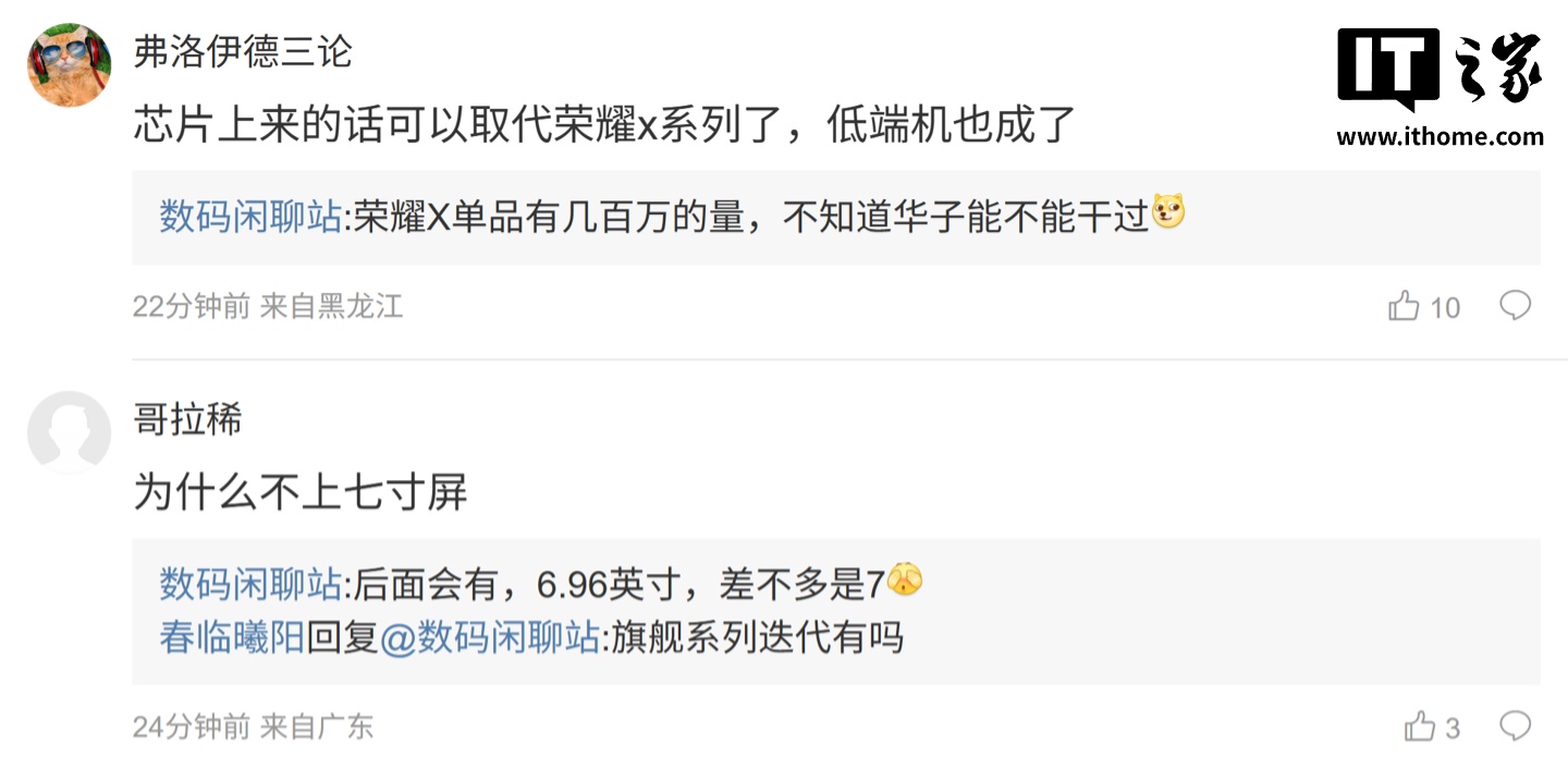后续有用户在评论区表示:“芯片上来的话可以取代荣耀 x 系列了,低端机也成了”,博主回复道:“荣耀 X 单品有几百万的量,不知道华子能不能干过 ”;另一名用户则询问道:“为什么不上七寸屏”,博主则回复道:“后面会有,6.96 英寸,差不多是 7”。
