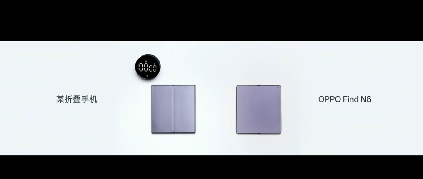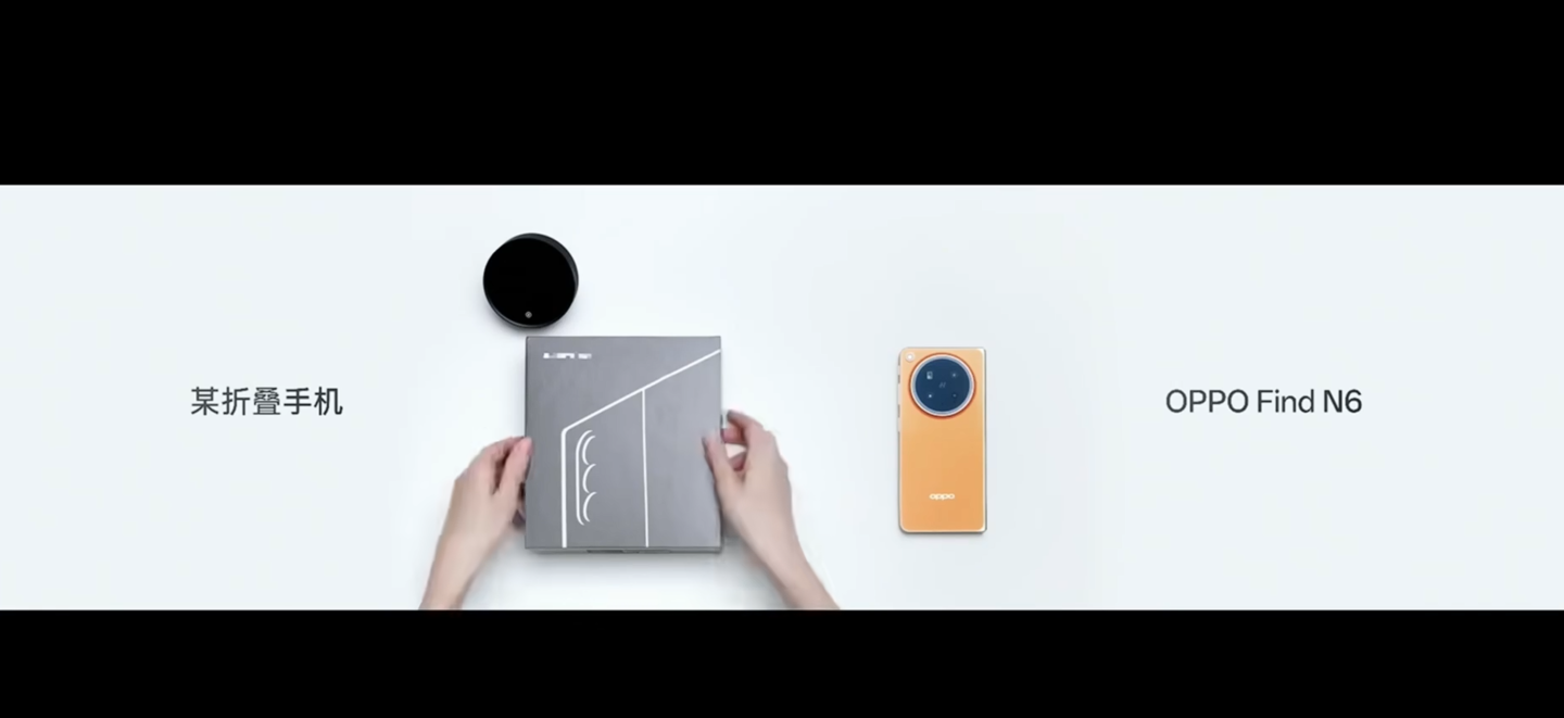 公开互联网资料显示,OPPO 在 3 月 17 日的 Find N6 新品发布会中放出了一段对比视频,展示该机与某友商产品在全新开箱状态下的折痕状态比较,虽然视频中仅以“某折叠手机”描述对比产品,并且包装盒文字也被打码,但结合机身外观形状我们不难看出该机为三星 Galaxy Z Fold 7。