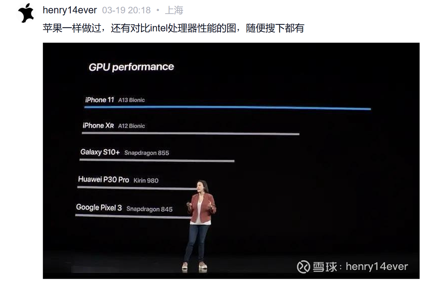 不过有网友在评论区认为,乔布斯时代苹果发布 MacBook Air 时就跟索尼对比。并且苹果一样会在发布会上对比 A 系列处理器和高通、海思麒麟等同类产品的性能差距。