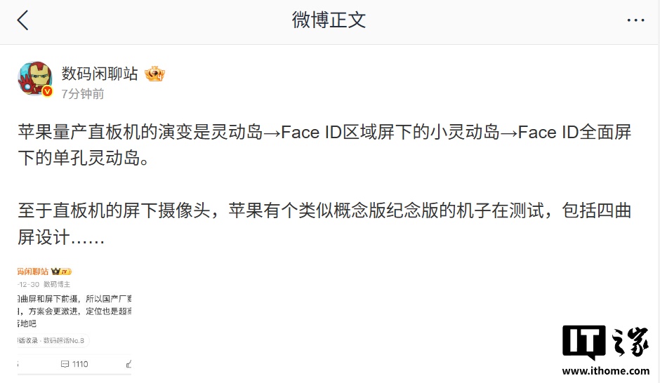 至于直板机的屏下摄像头,苹果有个类似概念版纪念版的机子在测试,包括四曲屏设计……