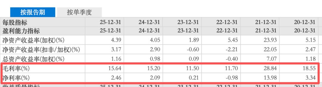 更刺眼的是利润率,2025年毛利率15.64%、净利率仅2.46%;而据东方财富,2021年这两项数据分别高达28.84%和13.98%,净利率被压缩到不足当年的1/5。