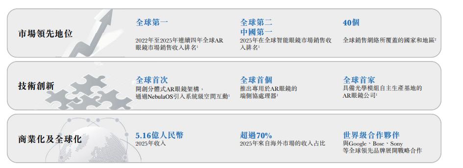 根据艾瑞咨询(iResearch)数据,按销售收入计,XREAL在2022年至2025年间连续四年在全球AR眼镜市场中位居第一。在包含无显示智能眼镜在内的整体智能眼镜市场中,2025年XREAL按销售收入计排名全球第二、中国第一。2025年,XREAL的全球AR眼镜营收市占率27.0%、销量市占率24.8%,均位列第一。