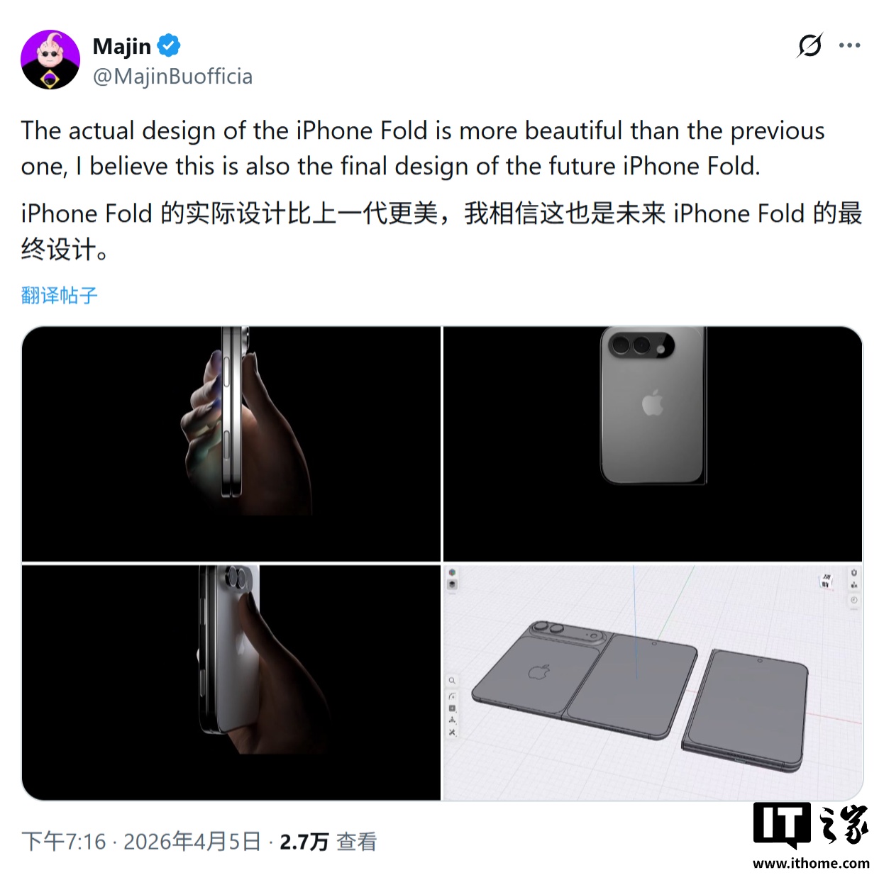 IT之家 4 月 7 日消息,消息源 Majin Bu 于 4 月 5 日在 X 平台发布推文,分享了一组渲染图,从多个角度展示了苹果首款折叠手机 iPhone Fold,并称新设计比此前版本更美观。