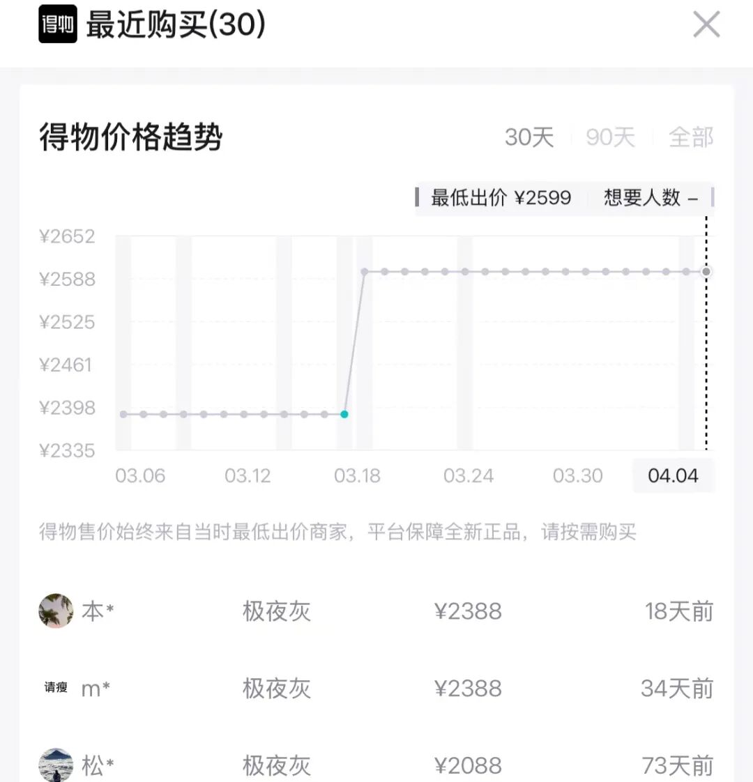 再比如海尔云溪洗烘一体机10Kg,得物APP显示,3月中旬时价格约2388元,4月4日已上涨至2599元,涨幅约8.8%。