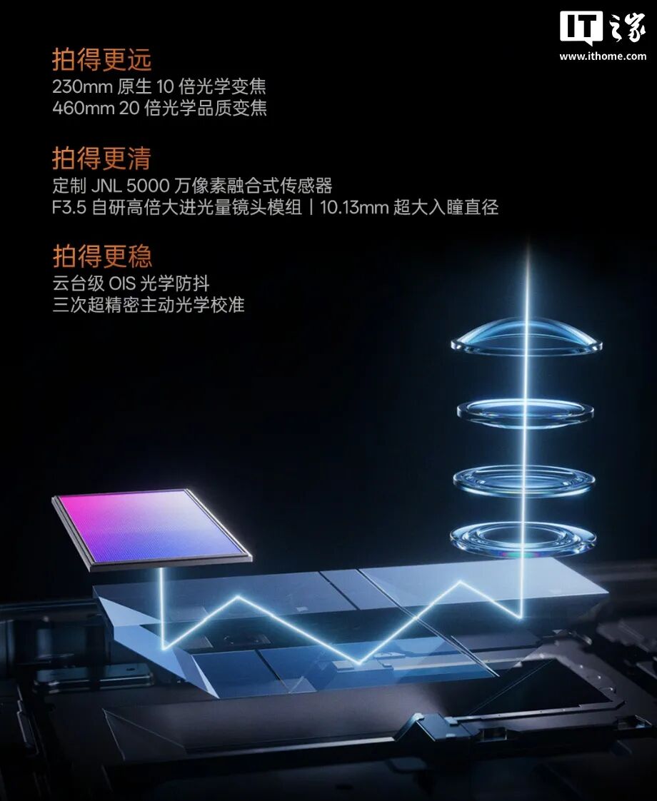 两颗潜望式长焦镜头,一颗为 2 亿像素 3X 潜望中长焦,另一颗则是 5000 万像素 10X 潜望超长焦。