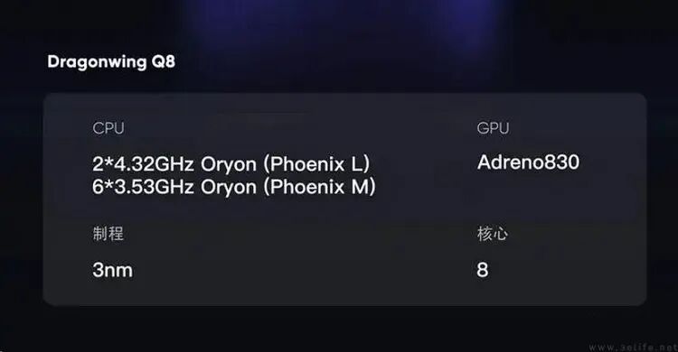 这两款芯片有什么区别呢?简单来说,跃龙Q8的“标准版”、即CQ8750S,基本可以认为就是骁龙8至尊版去掉了内置5G基带的产物,CQ8725S则据称在此基础上进一步简化了NPU和ISP规格。但在关键的CPU、GPU架构、频率等方面,跃龙Q8与骁龙8至尊版可以认为没有差别。
