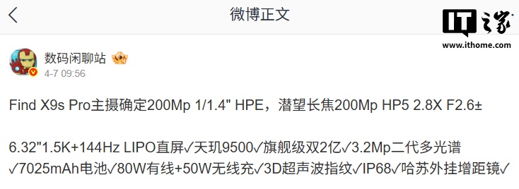 据博主 @数码闲聊站 此前爆料,这款新机配备 6.32 英寸 1.5K+144Hz LIPO 直屏,搭载天玑 9500 处理器、7025mAh 电池、80W 有线 +50W 无线充、3D 超声波指纹、IP68 级防尘防水。