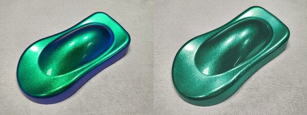 结构色(左)vs普通珠光色(右):色彩更饱和、闪烁度更高,能够以特定轨迹呈现色彩变化