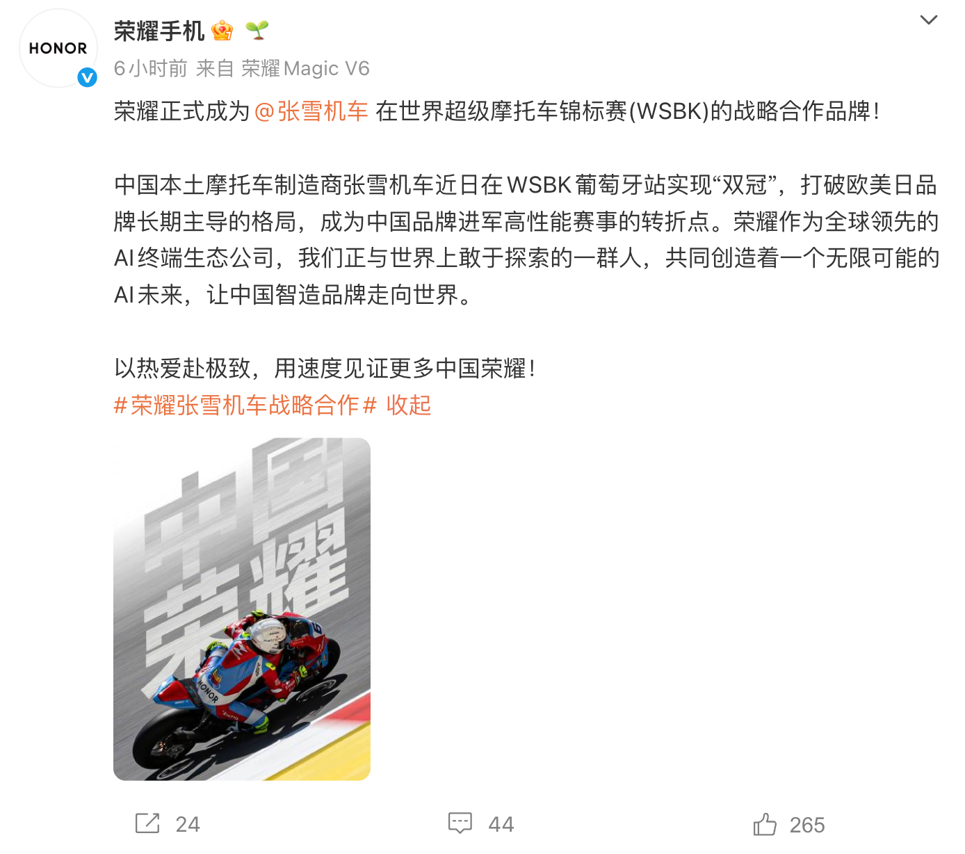 凤凰网科技讯 4月9日,日前,荣耀官宣成为张雪机车在世界超级摩托车锦标赛(WSBK)的首席战略合作品牌,携手展开系列品牌联动,共同推动中国智造品牌走向世界,实现全球价值跃升。