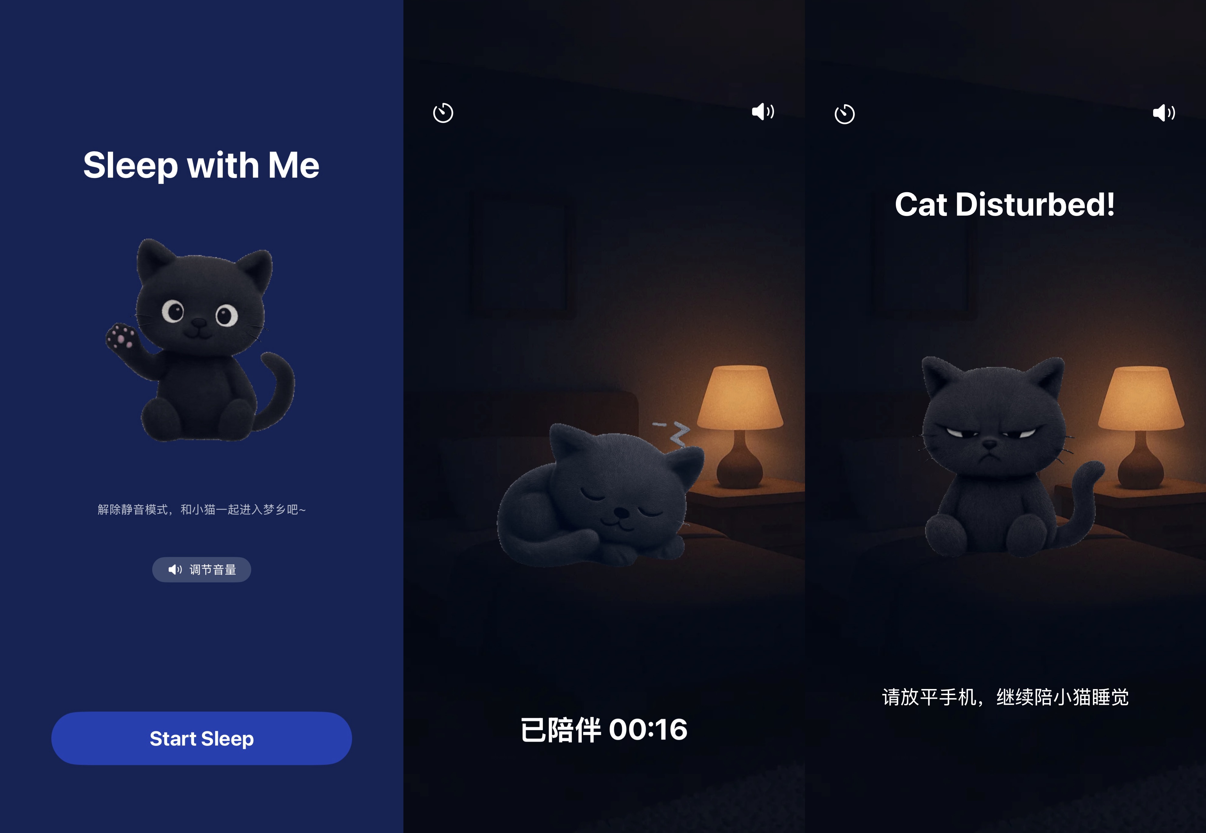 例如,有用户做出了「伴猫入眠」App:当手机平放时,界面会显示软萌的小猫睡眠动画,同时循环播放着小猫咪的呼噜声。
