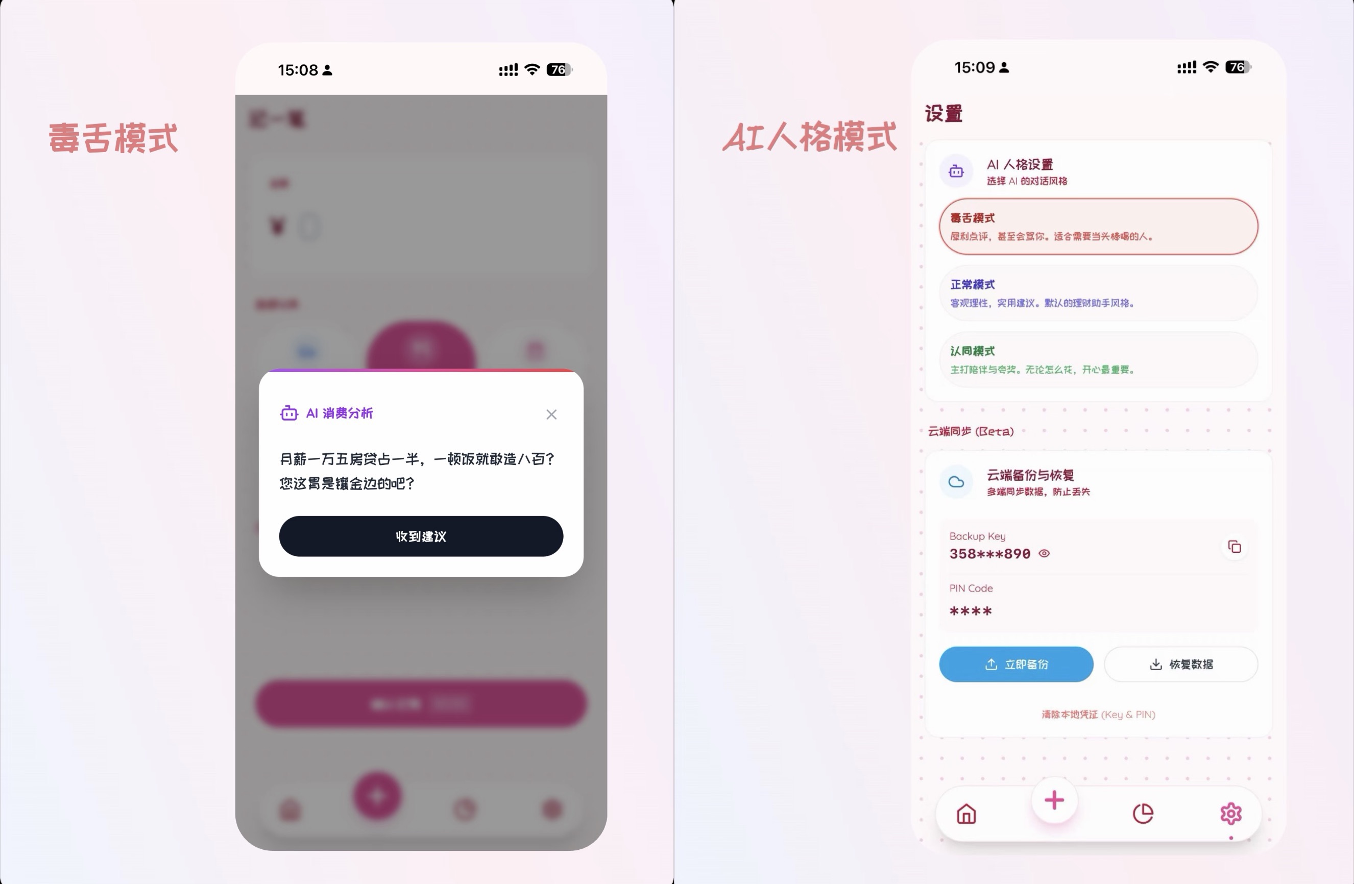 除了支持传统基础功能,氛围编程写出的一些记账App,还加入了更高阶功能,例如语音记账、AI自动分类/消费分析/预算规划,乃至可以进行AI人格(对话风格)设定和接入不同平台大模型等。