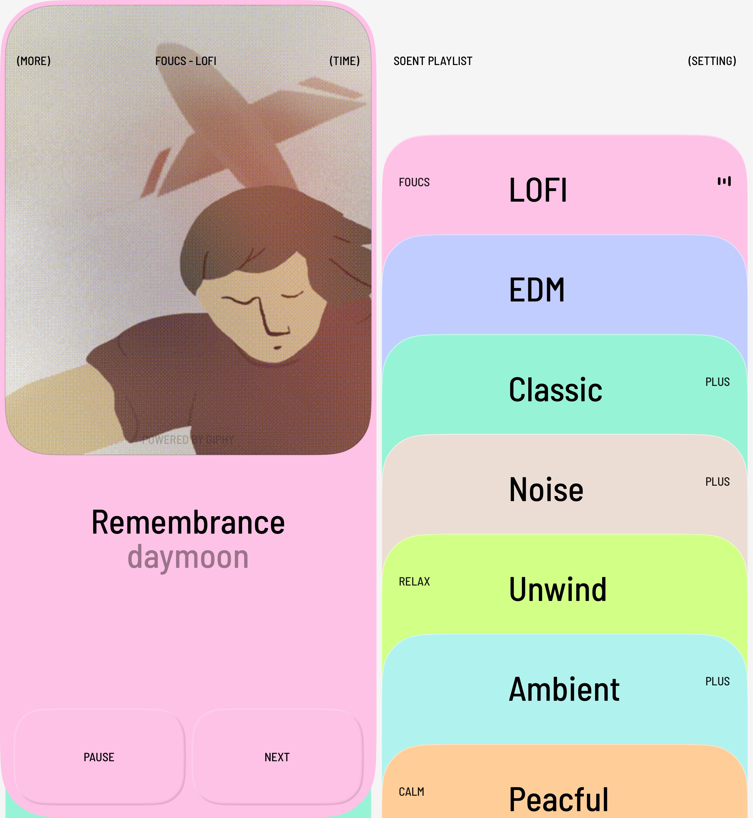作为一大亮点,SOENT可调用Apple Music曲库资源(注:用户需有会员订阅),搭档个人设计的全新界面和场景歌单,实现了对苹果轻音乐资源的「为我所用」和场景拓展。