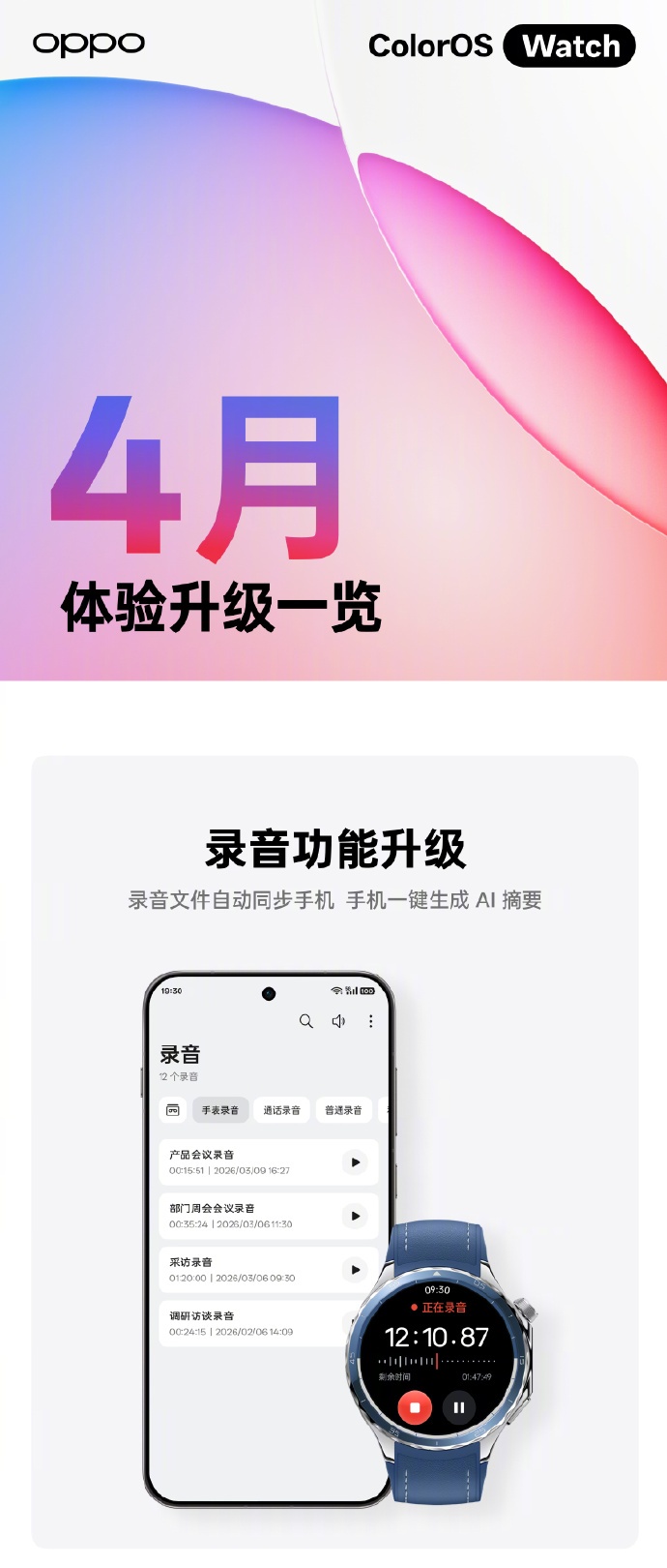 新增手表录音自动同步至手机功能,支持在手机端便捷查看,并可一键生成 AI 转文本与 AI 摘要