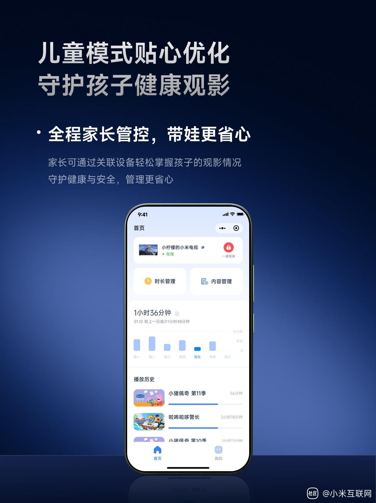 儿童模式远程管控能力全面提升:家长可通过关联设备实现电视一键锁屏、观影时长管理、观看报告查看等功能,轻松掌握孩子的观影情况,守护健康与安全,管理更省心。