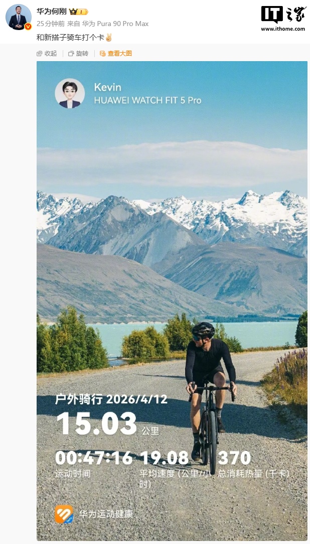 IT之家 4 月 12 日消息,华为终端 BG 首席执行官何刚今日发布微博:“和新搭子骑车打个卡”,配图中出现 HUAWEI WATCH FIT 5 Pro 的名称,暗示新品即将发布。