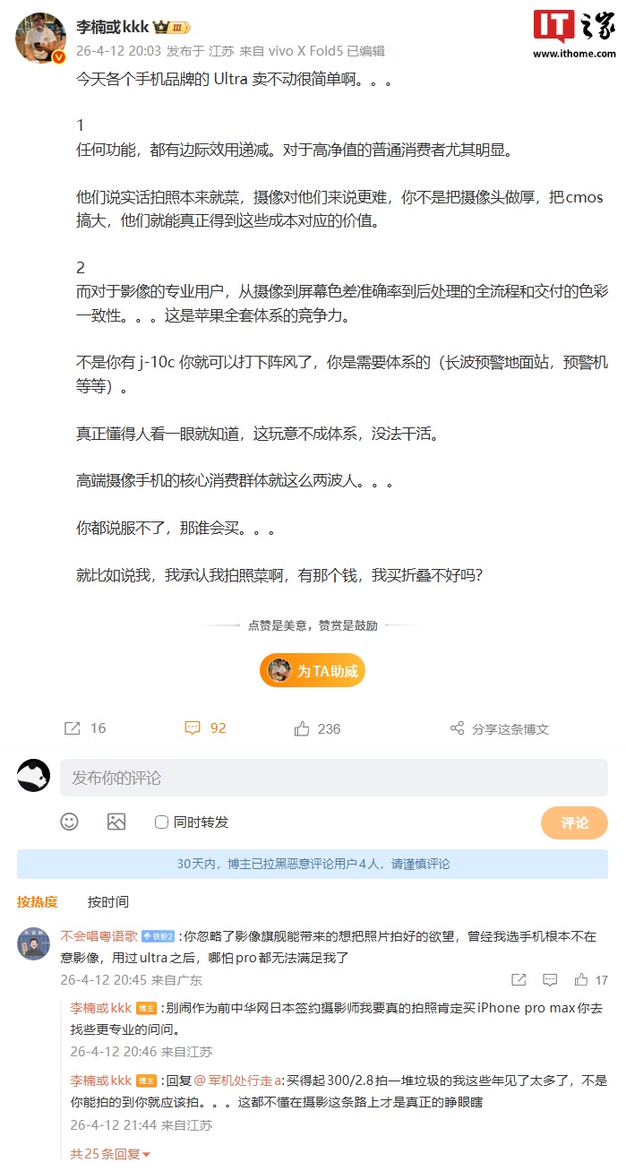 IT之家 4 月 13 日消息,Angry Miao 创始人、前魅族科技 CMO 李楠昨晚发文,谈及了如今各个手机品牌 Ultra 卖不动的原因。